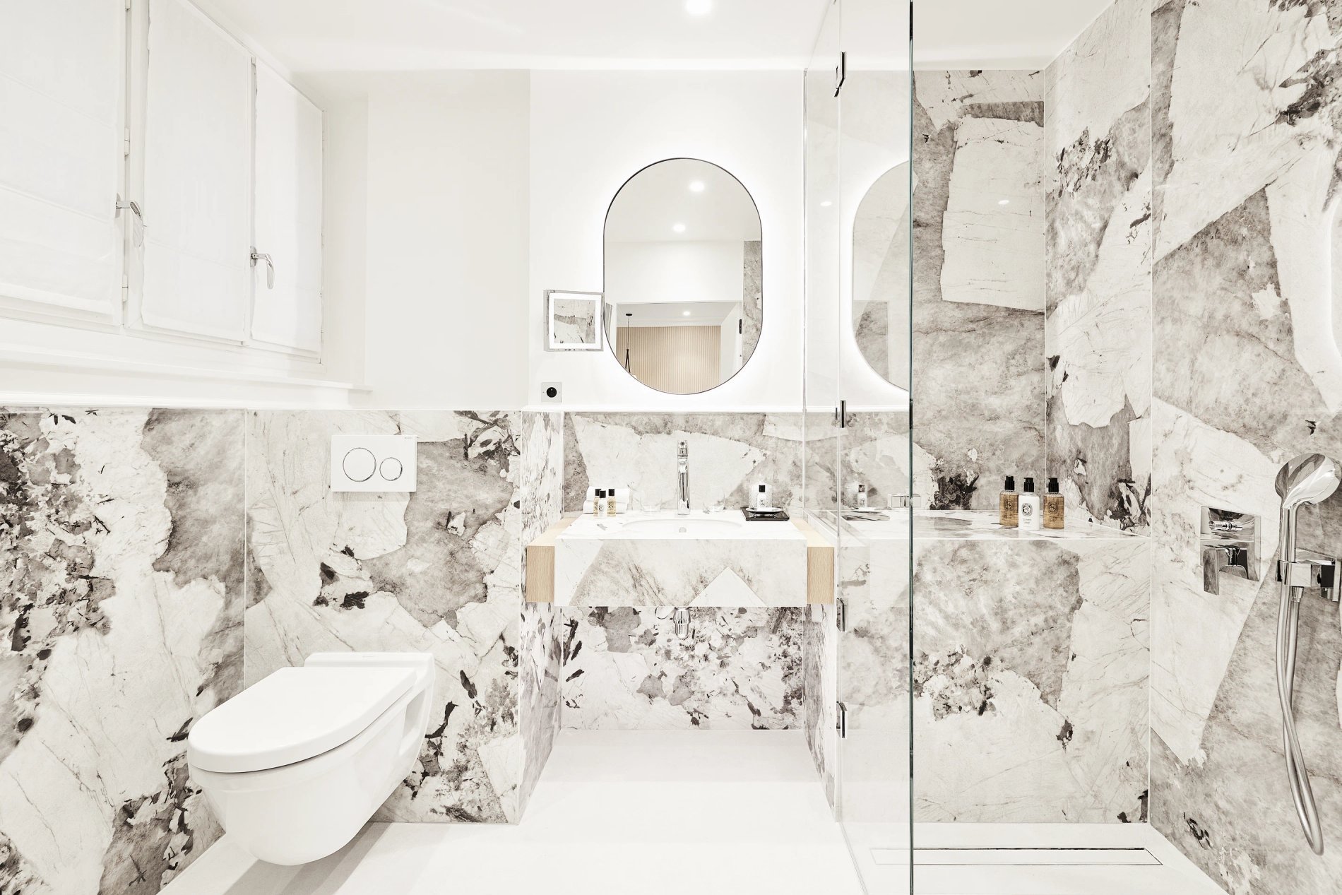 Spacious marble bathroom, equipped with a shower and a tub, separate WC.
